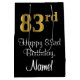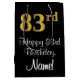 This stylish, luxurious, and elegant birthday-themed gift bag design features a large ordinal number “83rd” having an imitation/faux gold-like look, along with the birthday greeting message “Happy 83rd Birthday,” and a personalised recipient name in a script-style font. The background is coloured black. A stylish birthday themed giftbag like this might be used when giving a gift or present in celebration of somebody’s eighty third birthday. [~Z0000514]
