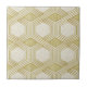 A sophisticated seamless geometric pattern ceramic tile featuring a grid of interlocking hexagons outlined in metallic gold. Each hexagon contains elegant linework and subtle geometric details, set against a softly textured cream and beige marble background. The blend of warm neutrals and gold accents gives this design a modern, refined, and luxurious feel.