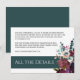A wonderfully luxurious wedding enclosure card to let your wedding guests know all the details surrounding your wedding accommodations, transportation, welcome reception and more. You can include your wedding website if you have one. This lovely design matches the invitation and has a sumptuous bouquet in painted watercolor hues of dark wine, eggplant purple, burnt orange, marsala red, deepest rose pink, beige, teal and green. A matching band of colour in teal forms the background to highlight the title of this card. The look is contemporary and artistically elegant. Personalise the text template with your important details.