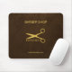 Barber shop mouse pad with faux gold scissors and barber script on a dark brown leather look background
