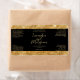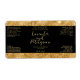 A label for cosmetics and/or soap products with a black background and a faux gold glitter border. This label contains space for your product name, business name, product weight, ingredients, instructions, social media, and business address. This label measures 3.75 inches by 2 inches (95 mm by 51 mm) and is suitable for bottles with a diameter of 1.2 inches (31 mm) or more such as 4 oz (120 ml) bullet, cylinder, and boston round bottles. It can also be used for cosmetic jars and other types of cosmetics packaging.