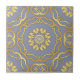 This ceramic tile exudes a blend of traditional elegance and modern sophistication. The tile is adorned with an intricate, symmetrical pattern featuring golden embellishments that beautifully contrast against the muted grey background. At the centre of the tile, a radiant sun-like motif acts as the focal point, surrounded by graceful curves and flourishes that extend towards the edges. This central design is echoed in each corner of the tile, albeit in a smaller size, creating a harmonious visual balance. The golden patterns exhibit a metallic sheen, offering a luxurious aesthetic against the matte background.