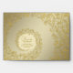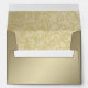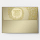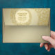 This envelope design is rich and luxurious, featuring an elegant gold damask floral frame that curls and flows around the centre. The intricate golden swirls and ornamental patterns stand out beautifully against the deep dark background, creating a regal and celebratory appearance. At the centre, the recipient’s name and address are showcased in matching golden text, blending seamlessly into the overall theme. The combination of dark tones with metallic gold gives this design a formal, sophisticated, and timeless charm—ideal for weddings, anniversaries, gala events, or high-end formal correspondence.