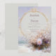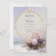 Invite your guests to a celebration of ethereal romance and coastal beauty with this exquisite wedding invitation. The design centers on a stunning central thin gold circular frame set against a luminous soft ivory and pale pink backdrop. The base features a stylized beach or waterscape, with soft waves meeting sand, all enveloped in a coastal mist. The lower portion of the frame is gorgeously accented by a lush cluster of white, lavender, and soft pink flowers and feathery dried foliage. The top is anchored by an ornate baroque gold crest with pearl accents. This aesthetic beautifully merges the seaside atmosphere with rich, opulent metallic accents, perfectly setting the stage for a luxurious, beach, or destination wedding. This invitation card is ideally suited for a coastal or beach wedding, a chic formal engagement celebration, or an elegant seaside party. It would also perfectly suit a sophisticated vow renewal ceremony or a serene, pastel-themed celebration. The card's captivating blend of ornate gold accents and ethereal florals ensures it is versatile for any solemn ceremony, corporate gala, or refined birthday announcement.