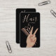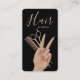 Elevate your personal brand with this luxury hairstylist business card, designed for modern beauty professionals who want to stand out with confidence and elegance. Featuring a sleek black background, soft rose-gold typography, and a stylish hand illustration holding scissors and a comb, this design perfectly reflects creativity, professionalism, and premium salon service.
