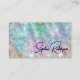 A business card with a pretty holographic glitter design featuring blue text on the front. The back features a blue background with white text.