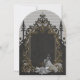 Luxury meets romance. An artfully designed black, silver gold frame adorned with delicate, filigree decorations. These loving details give the design an opulent touch and envelop the viewer with a feeling of festive anticipation. Within this magical frame, a woman reveals herself in a stunning wedding dress. The design exudes an aura of exclusivity and warmth