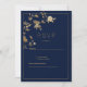 Rich navy blue paired with shimmering gold florals creates a stunning, upscale design.