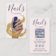 The front design highlights beautifully manicured nails wrapped in shimmering gold details, symbolizing precision, luxury, and expert craftsmanship. The back is clean and functional, offering space for essential contact details, phone number, QR code for easy appointment booking, business address, website, and social media icons—perfect for modern nail technicians and salon owners.