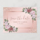 Elegant custom rose gold and blush pink floral wedding save the date postcard featuring blush pink roses and rose gold confetti framing all the important wedding details in a beautiful script font. Matching items available.