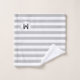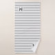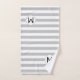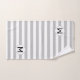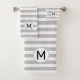 Elegant towel set with M letter with silver grey and white stripes on the background. Chic modern towel set.