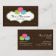 © 2014 Socialite Designs. Colourful macrons business card ready for you to personalise for your business. The macrons are in colours of pink, green and teal. The business card background has a brown damask pattern. Your business text goes into an elegant banner. All design elements can be moved, rotated, resized or deleted to suit you.