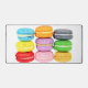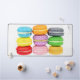 featuring an image of three stacks of colourful French macaron cream-filled cookie pastries in various flavours with the flavour names written in type font on each cookie.