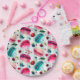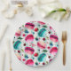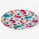 Paper plates with a watercolor pattern of sweet and delicious french macarons tumbling all around. Pretty watercolors - pink, red, and teal green. Random berries floating around too including strawberries, cherries and blueberries. Fresh and delicious. Set on a green polka dot background.