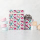 wrapping paper with a watercolor pattern of sweet and delicious french macarons tumbling all around. Pretty watercolors - pink, red, and teal green. Random berries floating around too including strawberries, cherries and blueberries. Fresh and delicious. Set on a green polka dot background.