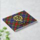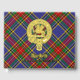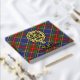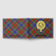 Clan MacBeth crest badge surrounded by a strap and buckle over tartan background. Custom front, back and spine text.