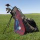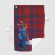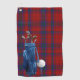 Blue and red golf towel done in the classic Scottish clan MacDougall tartan plaid pattern. Graphics of a blue golf bag with clubs and ball, decorate the left side of the towel.