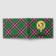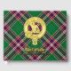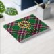 Clan MacFarlane crest badge surrounded by a strap and buckle over modern hunting tartan background. Custom front, back and spine text.