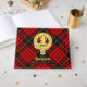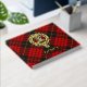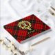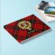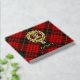 Clan MacQueen crest badge surrounded by a strap and buckle over tartan background. Custom front, back and spine text.
