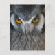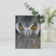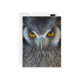 Postcard with a macro / close up photo of a black and white owls face.