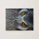 Jigsaw Puzzle with a macro /close up photo of a black and white scops owls face.