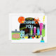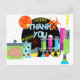 Colourful Mad Scientist thank you postcard with test tubes, beakers, jars with brains and eyeballs, specimens, and text that reads Thank You on front with an area on the back you can customise or leave blank to add a hand written message. We have the matching Mad Scientist birthday invitations!