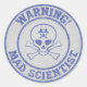 Warning! Mad Scientist - science humour sticker, faded blue lettering with skull and crossbones on a light grey background.