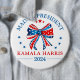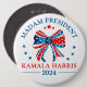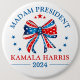Madam President Kamala Harris 2024 election button for democrats and Kamala supporters - with patriotic red, white and blue coquette bow ribbon and stars.