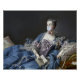 Madame de Pompadour blowing a blue bubble gum. She was mistress to King Louis XV and an influential figure of the French court. She is dressed in a sumptuous blue satin dress reclining with a book.