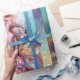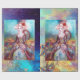 Elegant ,colourful ,classy and unique design in bright ,red ,pink ,blue white colours .Beautiful sophisticated blonde woman character,sparkling fabrics of a baroque costume with a red rose. Original watercolor and acrylic painting with gold foil and iridescent colours on canvas