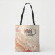 Tote bag depicts an abstract watercolor background with old music sheets. It features an inspirational Christian quote, "Made to Worship."