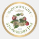 Vintage French illustration with strawberries. Editable text “Made With Love and booze (or bourbon)” and two gold hearts with gold border. Strawberry Jam.
