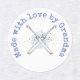 "Made with Love by Grandma" customisable text in typewriter style blue tint font with crossed crochet hooks illustration