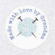 "Made with Love by Grandma" customisable text in typewriter style blue tint font with knitting needles and yarn illustration