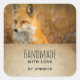 Handmade with love product stickers with a beautiful photograph of a red fox in autumn. Standing outdoors among the brush.