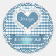 A warm, homey looking sticker design to label your baking or canned goods features the text 'Made with love in my kitchen I hope you enjoy every bite' wrapped around a heart that holds your name. A ribbon banner to hold your product name sits below the heart on a background of gingham in a scalloped circle. See other colour options by searching the title 'Made With Love Gingham'.