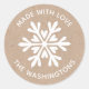 A kraft paper and white snowflake sticker with the words Made with love. Personalise it with your family name. Fun for your homemade or handmade Christmas neighbour treats and gifts, or for your craft business. Designed for you by Blackberry Boulevard.