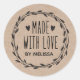 A personalised "made with love" sticker on a kraft coloured background surrounded by a laurel wreath and hearts. Make it yours by adding your own name. A pretty finishing touch for all of your handmade gifts. Designed for you by Blackberry Boulevard.