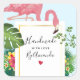 Made with love personalised stickers with a cute and whimsical pink flamingo. Surrounded by green tropical leaves, and red and yellow hibiscus flowers. A square gold gradient frame in the centre.