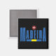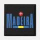 The country name has an extra large initial "M" at the beginning, and at the end of the country name is another extra large initial and that is "A". Below the text is a narrow strip made up of the country`s flag colours. Above the text is the Madeira Cross of Christ which features on the Madeira flag.