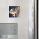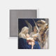 This is a gorgeous 19th century depiction of the Madonna and Child with angels. The Virgin Mary is dressed in blue and white robes and holds a sleeping baby Jesus on her lap. They are serenaded by angels. A truly beautiful Madonna and child magnet.