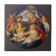 Madonna of the Magnificat by Sandro Botticelli, 1483, is a circular tempera painting on wood panel of the Madonna with Christ Child in her lap holding a song book of the Magnificat, the Song of Mary. Surrounding them is a group of youths resembling angels, holding aloft a golden crown radiating light. The round format of the picture is known as a tondo, a format used in some Renaissance religious paintings. The harmonious blue robes and drapery opening onto a view of a cool, Italian landscape give the impression of an otherworldly scene, as if painted on a sphere.