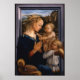 This painting is on display in the Uffizi Museum. It shows a praying Virgin Mary. Two angels are holding the child Jesus in front of Mary. Mary and Jesus both seem to be lost in their thoughts. Mary is depicted in a very elegant way compared to earlier paintings. For example, look at her sweet facial expression and the graceful veils and pearls in her hair. Notice also the halo above the heads of Mary and Jesus. These halos are just a simple circle and mark the transition between the solid gold discs used in earlier work and the disappearance of the halo in later Renaissance paintings. The angel on the right seems to giggle and watch the viewer directly in the eyes. Mary, Jesus, and the angels are depicted in front of a window, which can easily be mistaken for the frame of this painting. In the background, you can see a landscape inspired by Flemish paintings.