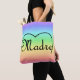 The Italian word for mother is madre. Done in black script and tucked inside of the top of a heart and on a rainbow printed tote bag