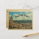 Vintage Madrid Save The Date postcards featuring a city view with mountains in the background. This cool mid-century retro design is the perfect way to gather guests to your Madrid Spain destination wedding.