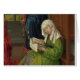 Vintage image of woman in green gown holding a book in her lap as she sits on the floor. Fine art by early flemish painter Rogier van der Weyden c 1450.