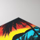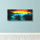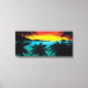 ©Glenesha Phipps All rights reserved. This is a wrapped canvas print of the original oil painting. Colourful landscape, red and yellow gradient sunset, with green, teal, turquoise water. Silhouettes of islands in the distance in palm trees in the foreground. Abstract oil painting print by Glenesha Phipps.