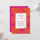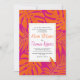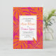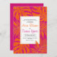 Magenta pink, orange and gold monstera and palm leaves wedding invitation. Thos beautiful wedding invitation displays a pattern of vibrant orange tropical leaves with gold outline and your text in a white frame on magenta fuchsia background. The back includes a gold polka dot pattern on orange background.