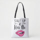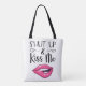 This trendy kiss me tote bag features a drawing of a pair of magenta cartoon lips and the caption Shut up & Kiss Me in a black modern font on a plain white background.