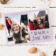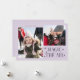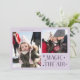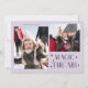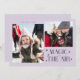 Minimal and modern holiday photo template card featuring 2 photos on the front with a typography text that says "magic in the air" with stars. You can also add another picture and message on the back. The background is purple.